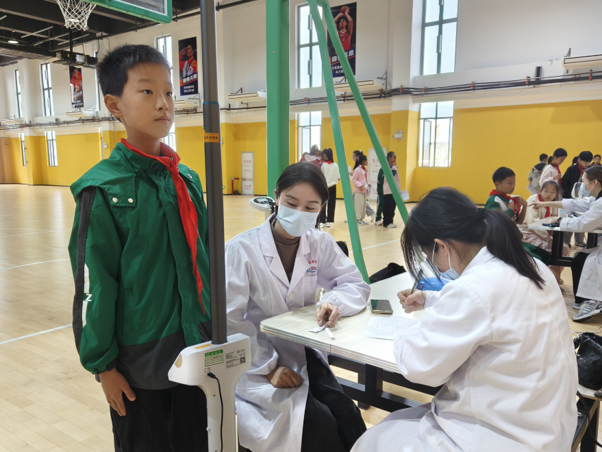 活动现场,工作人员严格遵循流程,携带专业检测仪器有序开展检查。从身高、体重、腰围等基础指标测量,到血压监测、龋齿筛查,再到视力检测、屈光度评估及脊柱弯曲排查,每项检查均细致严谨。现场实行“一人一档”管理,工作人员实时将体检数据记录在监测表上,并结合学生个体健康状况,针对性给出用眼保护、饮食作息等建议,引导学生养成良好生活习惯。