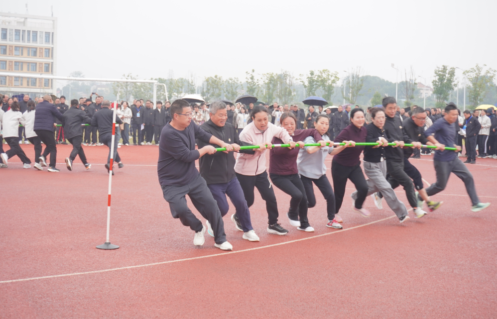 赛场之上,平日里深耕三尺讲台的教育工作者们褪去书卷气,化身活力飞扬的运动员,全身心投入比赛。“一起向未来”项目中,队员们同握长竿、步调协同,绕杆穿梭间划出流畅的“8”字弧线,尽显团结默契;陆地龙舟赛道上,参赛教师紧握竹竿、深蹲疾行,整齐的号子声与脚步声交织,如“龙舟”破浪般奋勇争先;袋鼠跳比赛妙趣横生,老师们手提跳袋、奋力蹦跃,矫健的身影与阵阵欢笑相映成趣,现场助威声、喝彩声此起彼伏。广场舞展演环节,各代表队伴着激昂乐曲翩然起舞,充分展现了沙洋教职工昂扬向上的精神风貌。