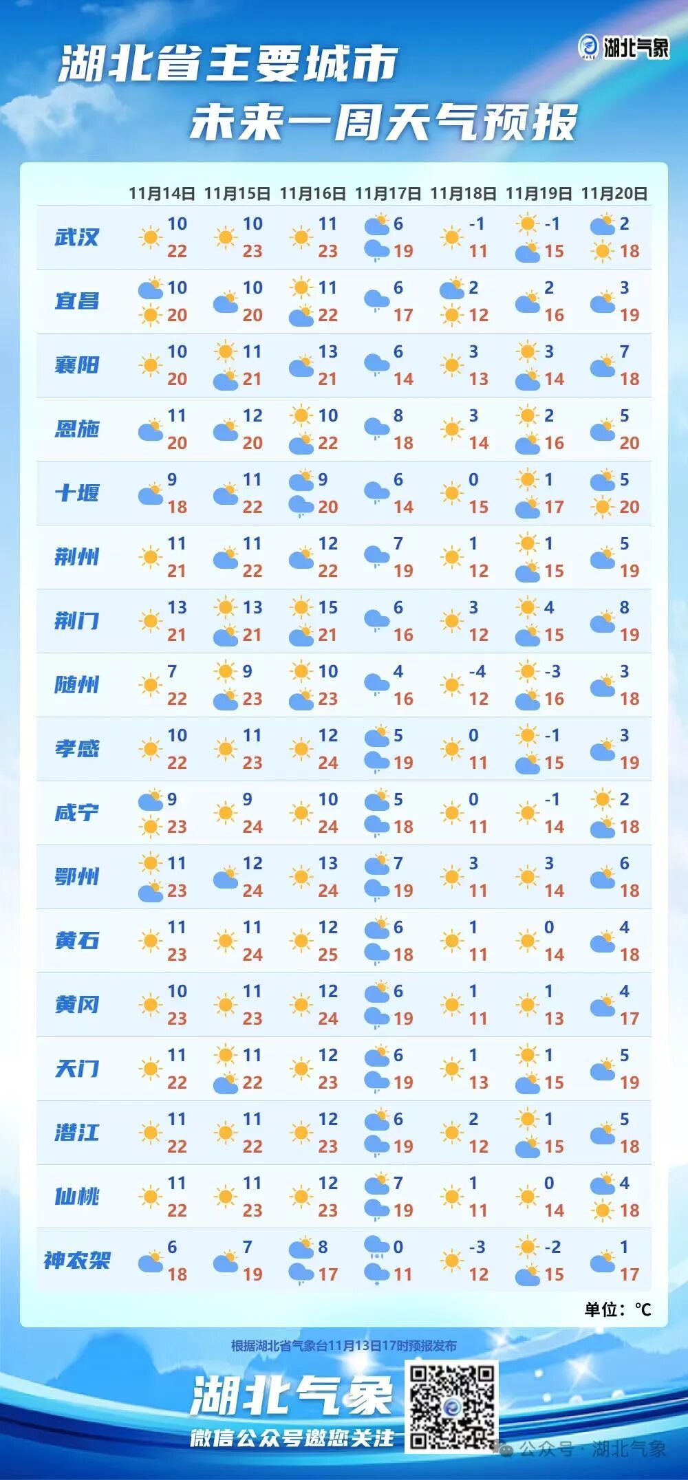 预计此轮较强冷空气携风雨雪前来,气温开始“断崖式”下降,18日起武汉、神农架、随州、孝感等地最低气温将陆续跌至0℃或以下,最高气温也仅10℃出头。冷暖明显转换,公众需注意气温变化,及时调整着装,以免着凉感冒。