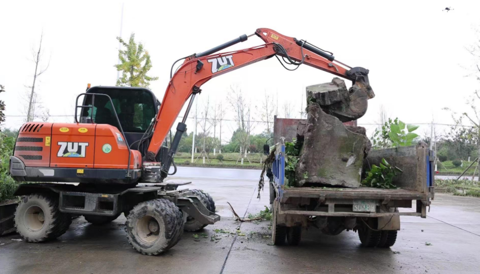 在滨江新区长林社区荆新线,机械作业与人工清扫同步推进、高效配合。挖掘机轰鸣作业,集中清理道路两旁的杂树、灌木及长期堆积的建筑垃圾;身穿红马甲的社区工作人员与热心居民组成多支清扫小分队,手持扫帚、铁锨等工具,细致清扫沿线路面的落叶、白色垃圾,不放过任何卫生盲区。
