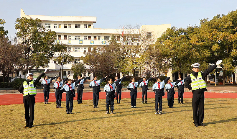 11月24日下午,高阳中心小学的课间操时间,交警带领同学们跳起交通安全手势舞,学生们在欢快的节奏中汲取交通安全知识。