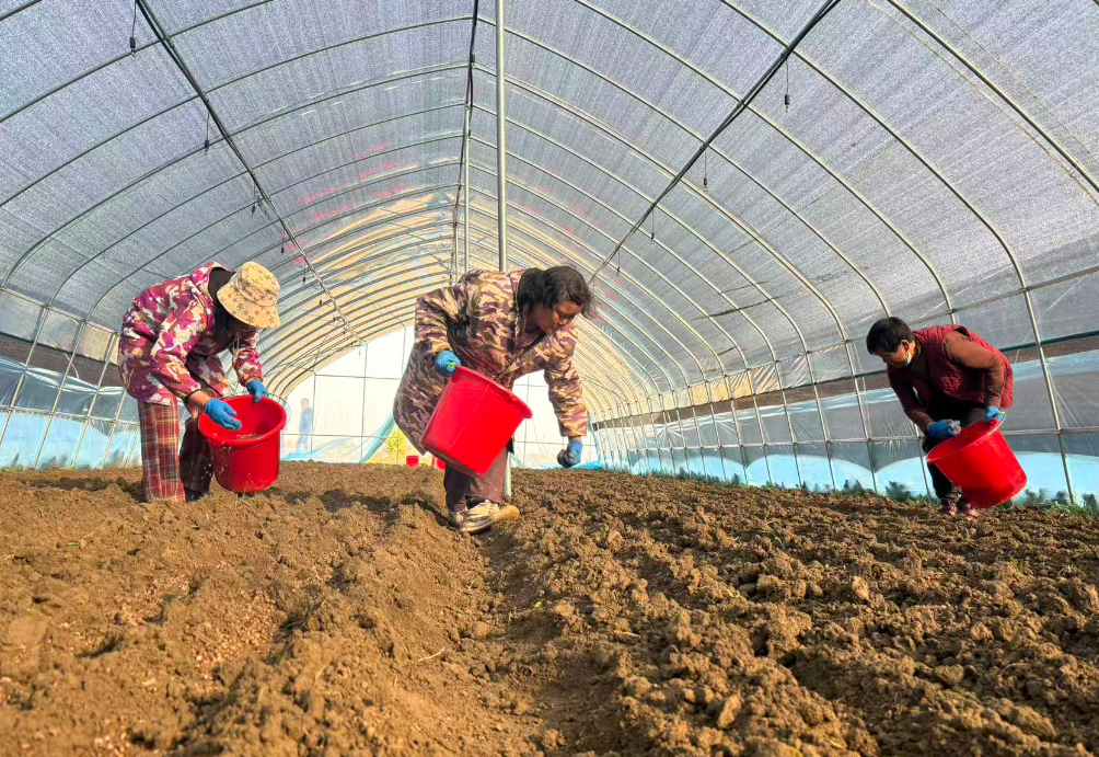 冬日暖阳下,李市镇沈桥村的羊肚菌种植基地里一片繁忙,村民们正有条不紊地翻土、撒菌种、覆土,指尖翻飞间,将一颗颗黑色菌种精心播撒在松软的基质中,种下致富的新希望。