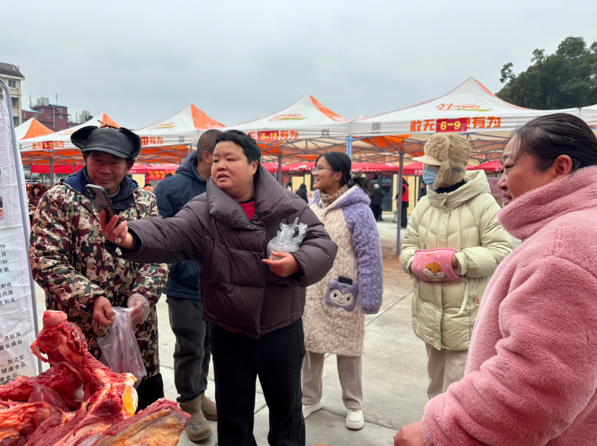 “要过年了,我们今天拉来200多斤新鲜猪肉,都是品质上乘的好肉,适合灌香肠、晒腊肉。”猪肉商铺老板聂光明一边麻利地给顾客称重,一边热情介绍,“不到一个小时就卖了100多斤,而且买肉就能开发票抽大奖,说不定哪位幸运儿能把坦克300开回家呢!”