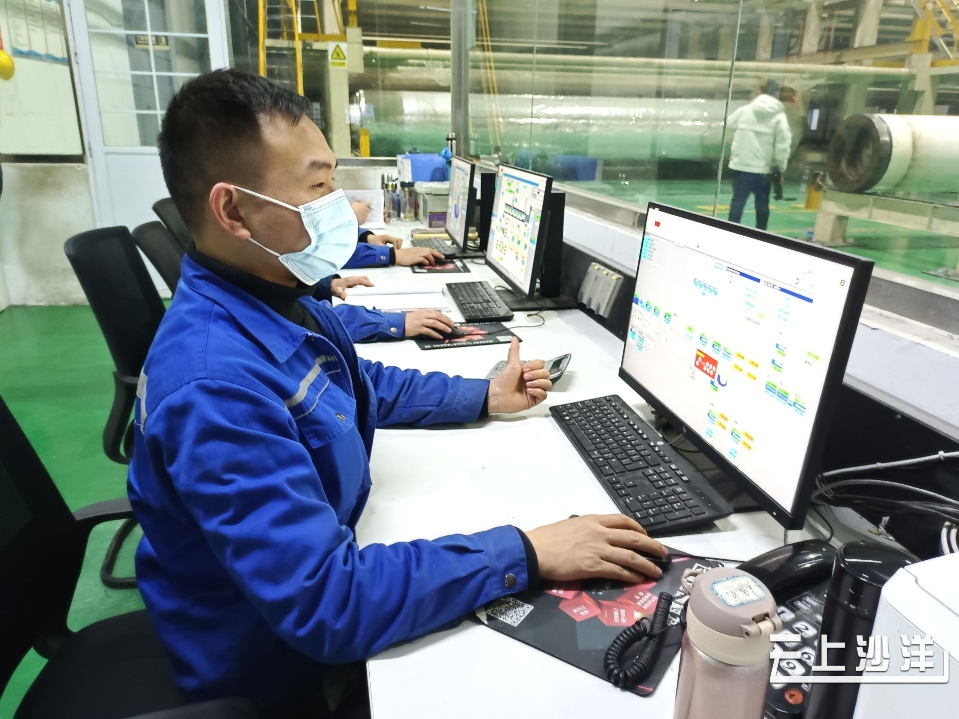 在该公司的中控室内,制膜车间班长彭警军和他的同事正目不转睛看着电脑屏幕,时刻对生产线的运行状况、数据分析、工艺设定等进行监控和操作。