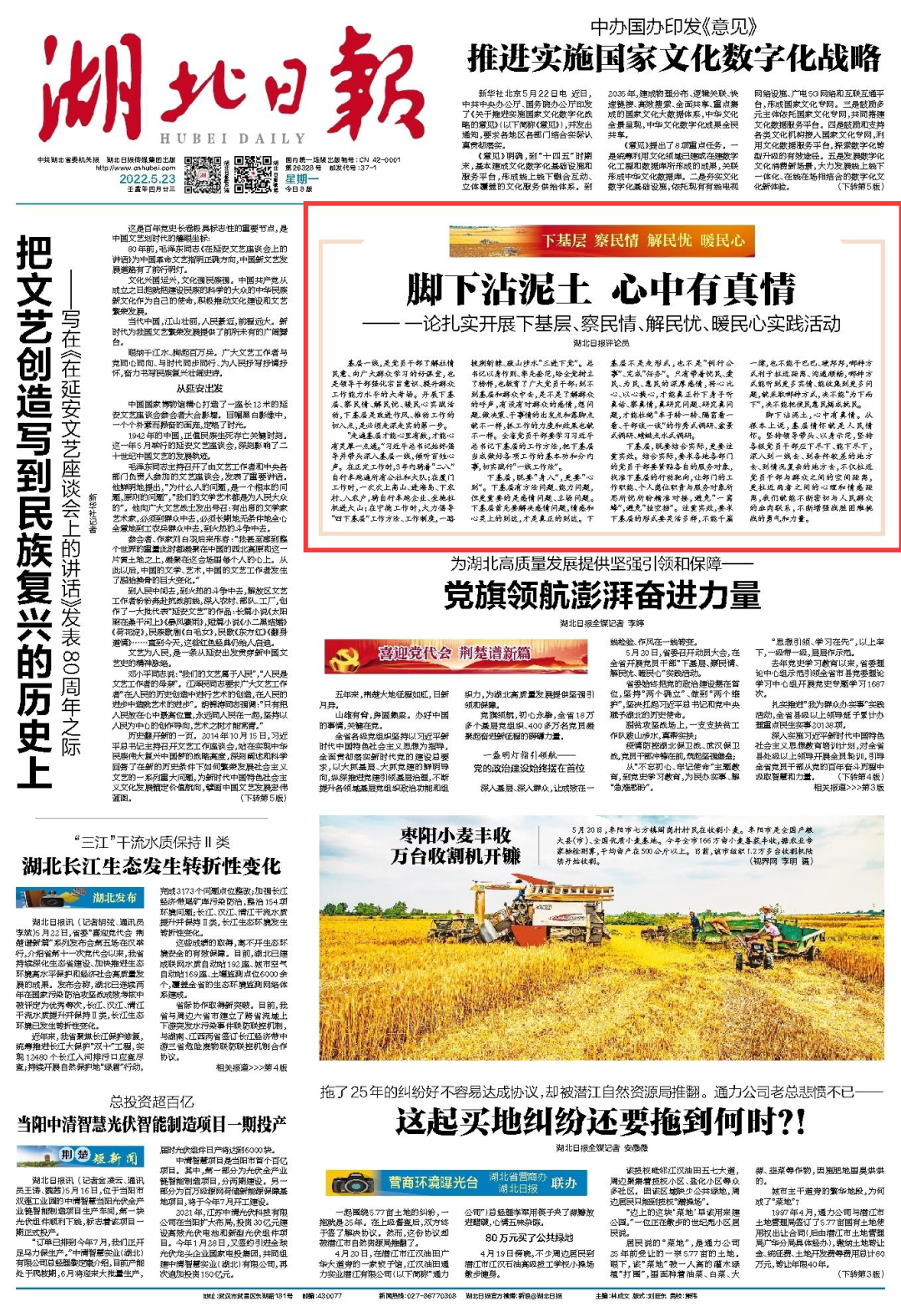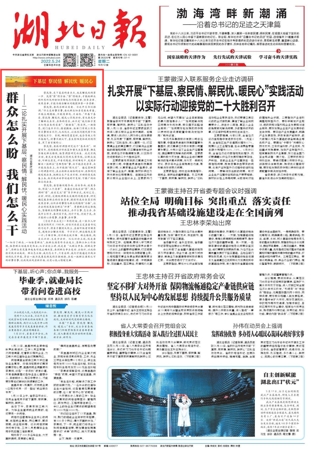 5月20日,省委召开开展党员干部“下基层、察民情、解民忧、暖民心”实践活动动员大会,标志着“下基层、察民情、解民忧、暖民心”实践活动正式启动。湖北日报一版连续刊发四篇评论员文章,推动全省广大党员干部把握实践活动重要要求,确保实践活动取得实效。