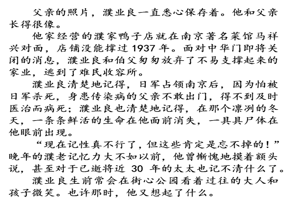 “我的生父当年住在中华门外的西街,被日军杀害了,尸体一直没找到。我养父被日军打了两枪、刺了七刀后侥幸活了下来。”