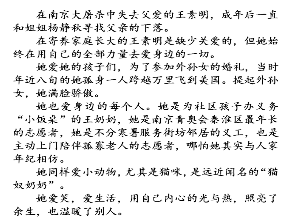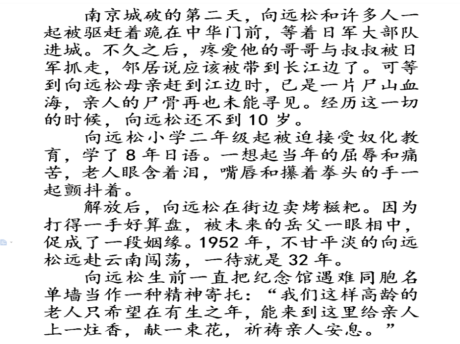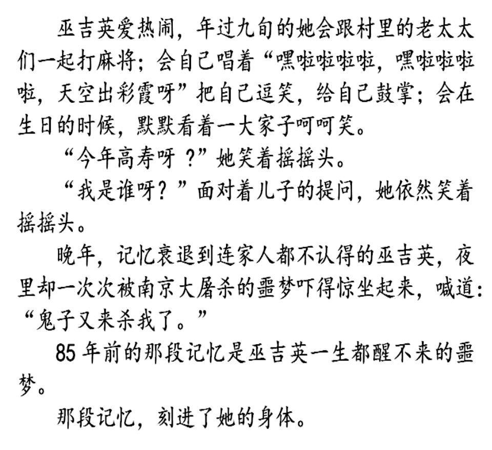 “我从小被家人卖到南京做佣人,大屠杀时主人一家都逃跑了,只留下我一人和他家老太太。一天,两个日本兵从后门进来了,在我的大腿上刺了一刀,到现在我的腿上都有疤痕。”
