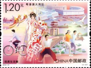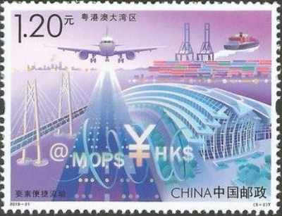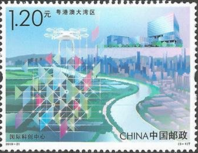 2019年9月26日,中国邮政发行《粤港澳大湾区》特种邮票,一套3枚,邮票图案名称分别为“国际科创中心”“要素便捷流动”“优质生活圈”。