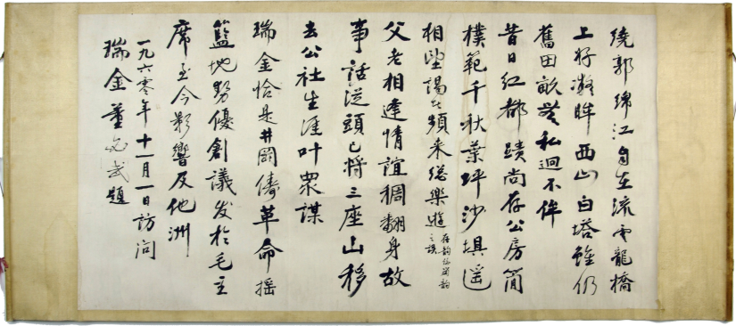在江西瑞金中央革命根据地纪念馆,有一幅用宣纸装裱的字画格外珍贵,这是董必武1960年访问瑞金题诗手迹,为国家一级文物。1960年11月,时任中共中央政治局委员、中央人民政府副主席的董必武带着党中央和中央人民政府对老区人民的关怀访问瑞金,有感而发,挥毫写下组诗四首。该题诗为横长方形,纵99厘米,横202厘米,用墨汁从右至左直排书写,书法雄健遒劲、淳厚圆润,诗文气势豪放、一气呵成。