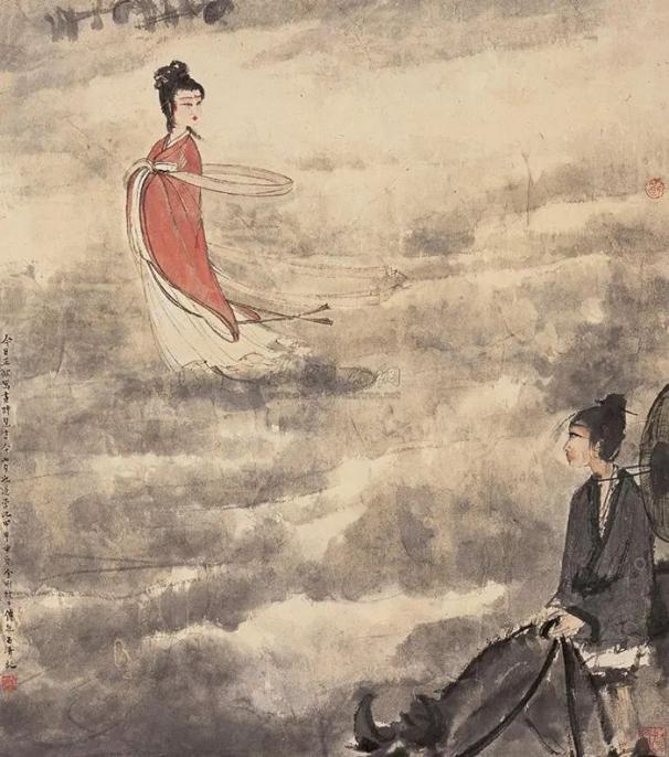 著名画家傅抱石的《七夕图》,讲述的也是牛郎织女的故事。右下角的牛郎骑在牛背上,抬头仰望天上的织女。织女则拂于云端,衣带飘然,不经意地回眸,目光正落在爱人身上。画面素雅,人物生动,于无声处显情深。