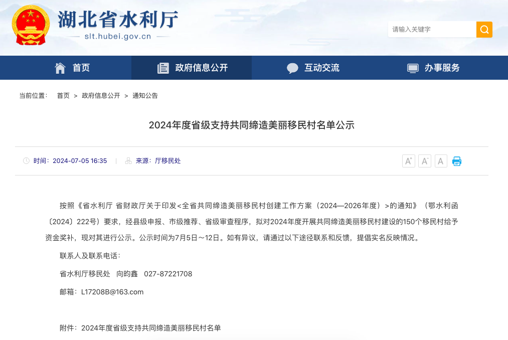 按照《省水利厅 省财政厅关于印发<全省共同缔造美丽移民村创建工作方案(2024—2026年度)>的通知》(鄂水利函〔2024〕222号)要求,经县级申报、市级推荐、省级审查程序,拟对2024年度开展共同缔造美丽移民村建设的150个移民村给予资金奖补。