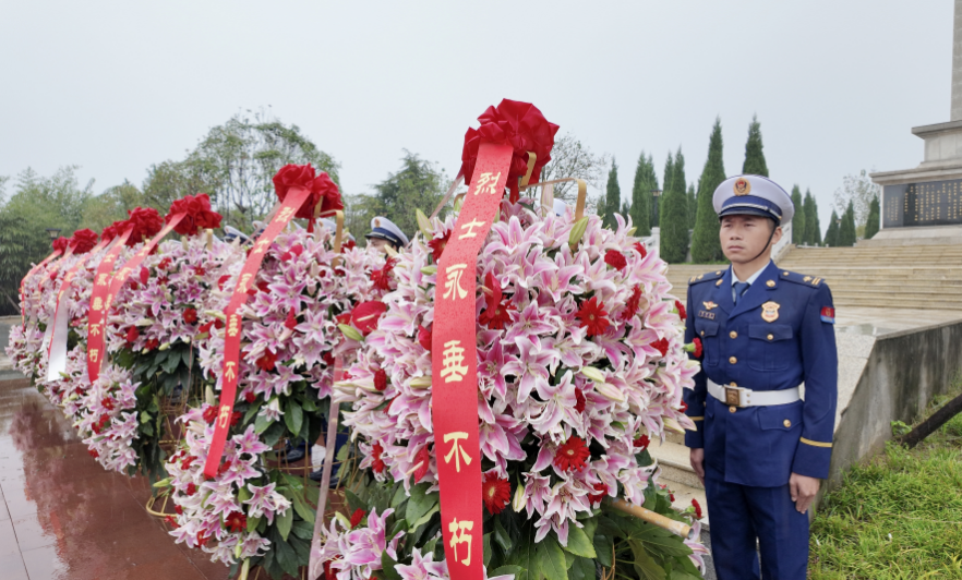 苍松翠柏掩映下的烈士陵园庄严肃穆,革命烈士纪念碑巍然矗立。上午9时,烈士纪念活动正式开始。全体人员奏唱中华人民共和国国歌,庄严雄壮的歌声飘扬在烈士陵园上空。国歌毕,全场肃立,向革命烈士默哀。随后,少先队员齐声献唱《我们是共产主义接班人》,表达传承革命先辈光荣传统、追寻烈士足迹前进的远大志向。伴随着深情的《献花曲》,14名礼兵双手托起花篮缓步走向革命烈士纪念碑,摆放在纪念碑基座上。陈威缓步上前,仔细整理花篮缎带,敬献了鲜花并瞻仰纪念碑。随后,参加纪念活动的全体人员依次上前,敬献手中鲜花,绕纪念碑一周瞻仰革命先烈,共同缅怀为国家、为民族而英勇牺牲的革命先辈,寄托对烈士们的无限哀思。