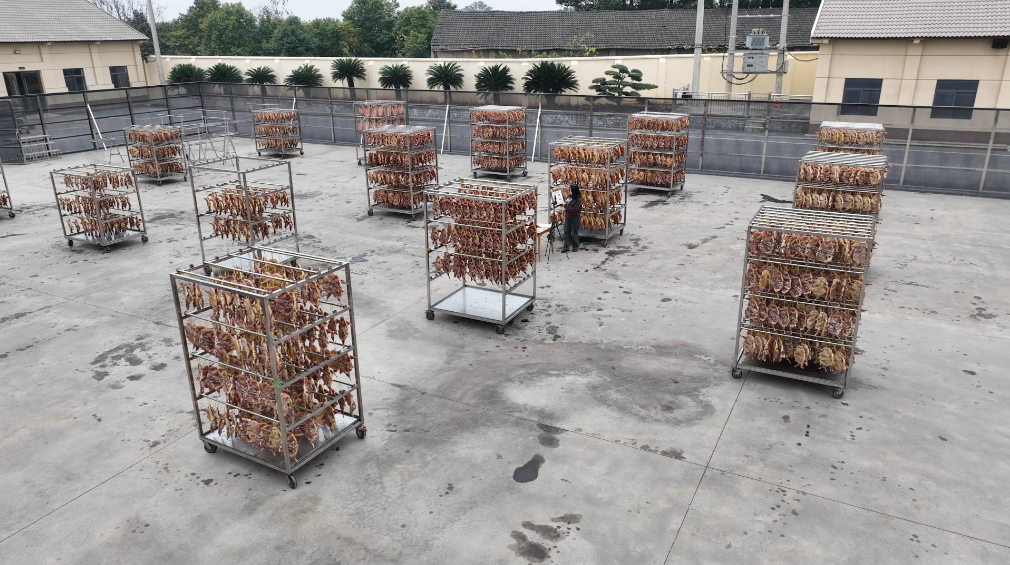 与美芝的“科技感”相映成趣,沙洋十里德顺食品加工厂更显“时光的厚度”。记者走进晾晒场,冬日暖阳下,数千只腌制入味的鸡正自然风干,表皮逐渐泛起诱人的琥珀色。“我们的风干鸡,承续近两千年荆楚腊味工艺,再融入现代科学配方,醇香软嫩不油腻,老少皆宜。”公司销售总监刘春晓笑着说。