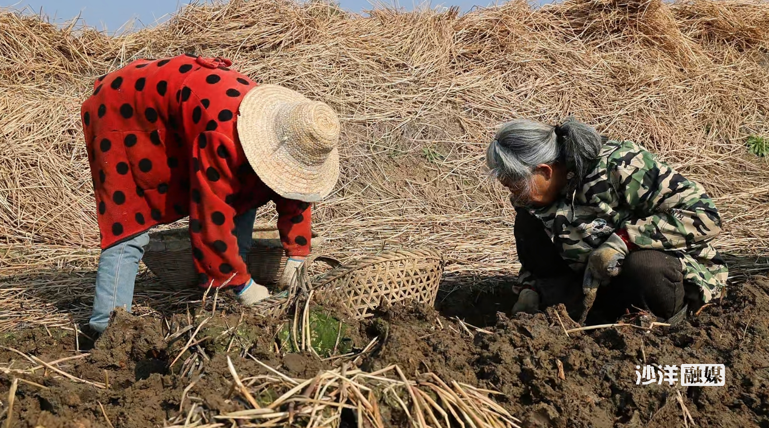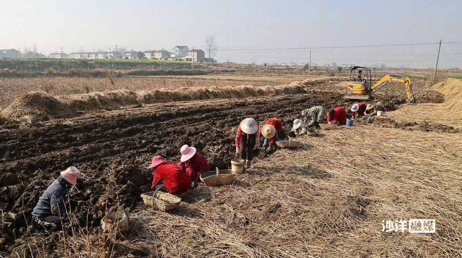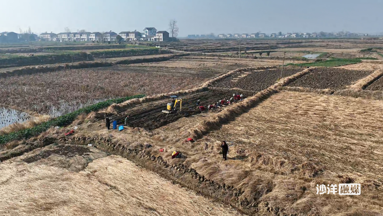 冬日的清晨,江汉平原笼罩着一层薄雾。在毛李镇借粮湖村的田野里,却已是一片热火朝天的景象。一台挖掘机轰鸣着穿梭其间,铁铲精准翻挖,湿润的泥土裹挟着圆滚滚的荸荠翻涌而出;田垄上,十余位村民手持小铁铲紧随其后,弯腰俯身分拣、深挖,不一会儿,沾满泥浆的荸荠就装满了竹篮。