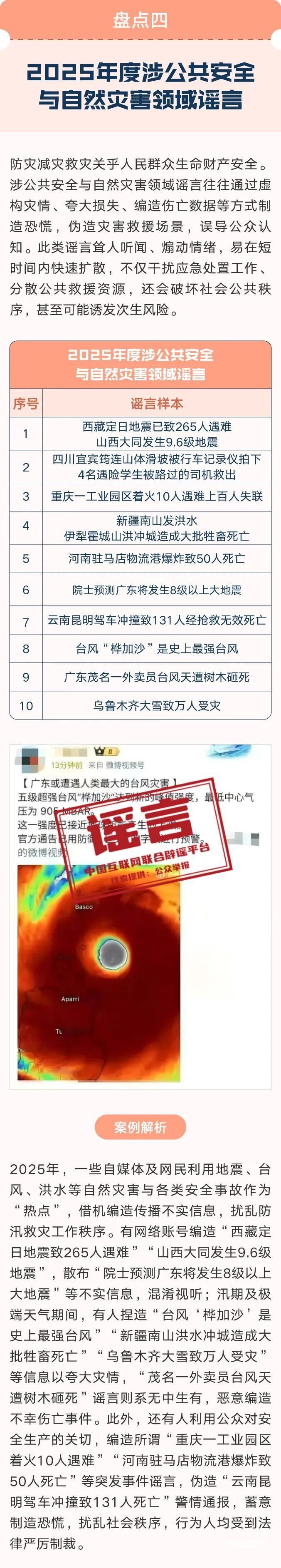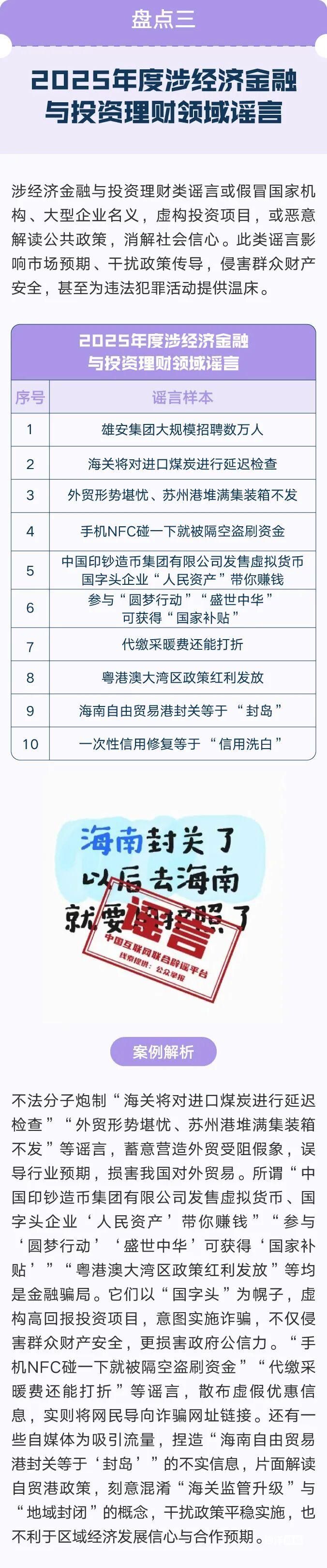 为坚决遏制谣言传播,净化网络生态,在中央网信办违法和不良信息举报中心指导下,中国互联网联合辟谣平台持续发挥权威辟谣主力军作用。2025年共发布各类辟谣稿件1.7万余篇,推出12期《月度辟谣榜》、248期《今日辟谣榜》,《今日辟谣榜》荣获“2025年网络文明建设优秀案例”。与中国人民银行、中国科协等多部门联合发布《经济金融领域年度网络辟谣榜》《利用AI生成类谣言辟谣典型案例》《科学领域流言月榜》等多份专项辟谣榜单,及时阻断网络谣言传播。