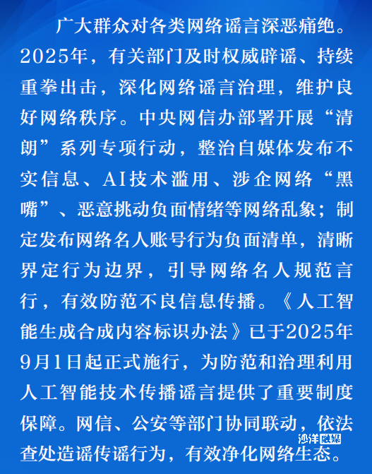 回顾2025年,在公共政策、社会事件、经济金融、灾害事故、科学知识等公众关心关切领域,网络谣言不时滋生蔓延。随着人工智能(AI)技术浪潮汹涌,越来越多的网络谣言搭上AI的“快车”,歪曲事实、误导认知,污染网络空间。
