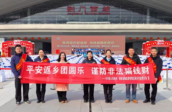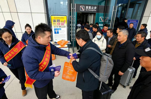 荆门西站,金融机构志愿者在出站口值守,为返乡务工人员送上装春联、小礼品和防非反诈宣传单的“新春福袋”,结合务工群体工资结算、理财需求,讲解网络诈骗、非法集资套路,传授“三不一多”防骗口诀。