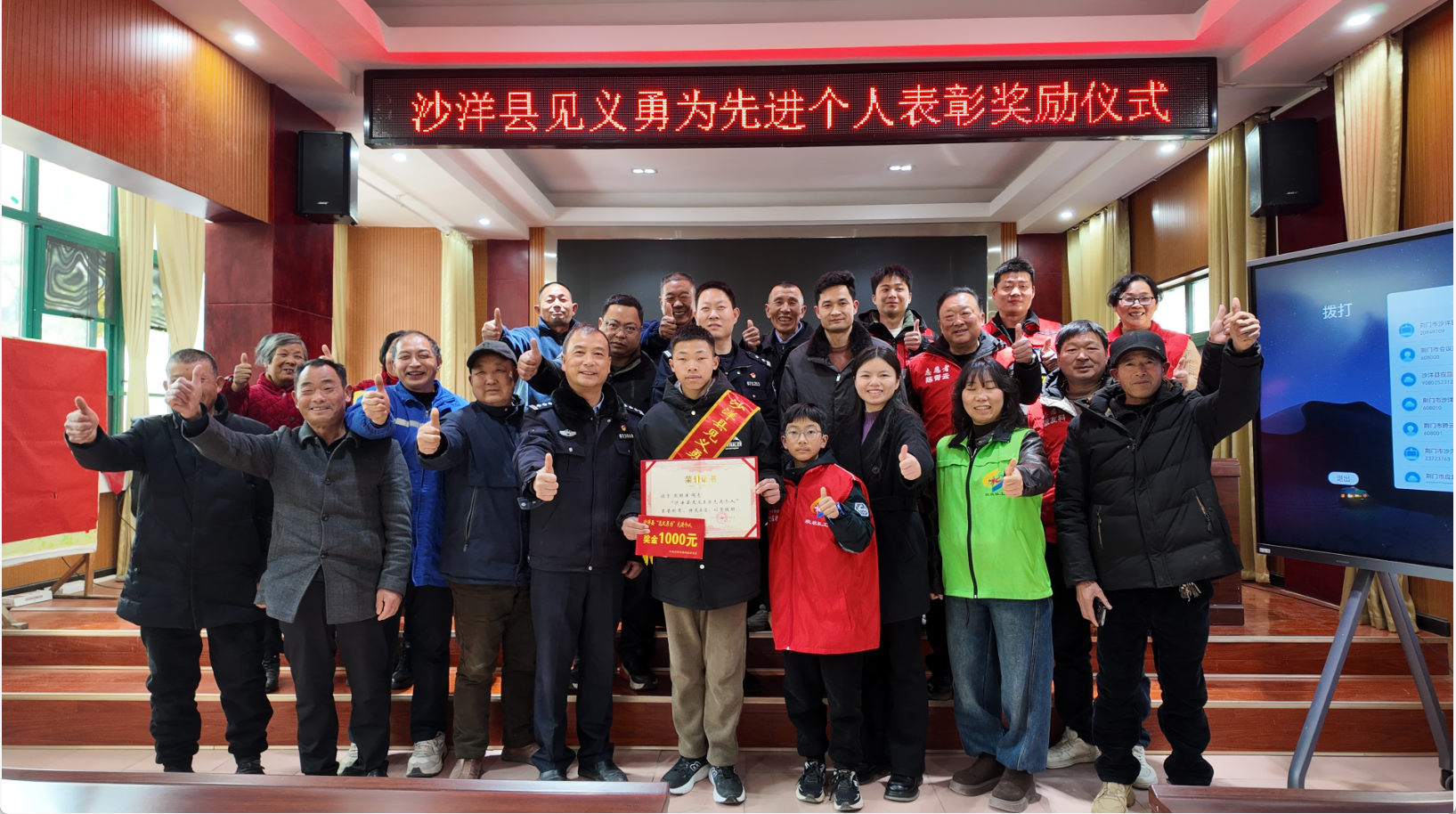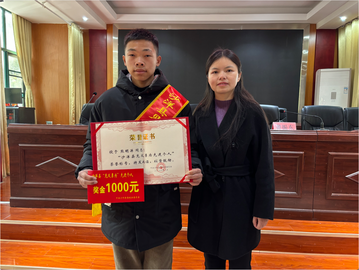 2月12日,沙洋县举行见义勇为先进个人荣誉授予仪式,为熊明洋、邓胜(化名)颁发“沙洋县见义勇为先进个人”荣誉证书及奖金,以榜样力量弘扬社会正气、传递文明新风。
