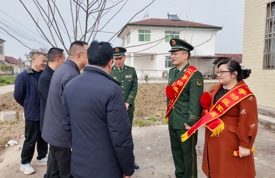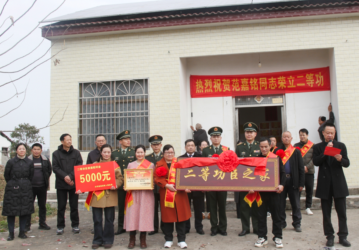 2月12日,副县长谢振波、县人武部部长吴军锋,以及武警江苏省总队某部、县退役军人事务局及官垱镇相关负责人,一同来到官垱镇同兴村,为荣立个人二等功的现役军人范嘉铭家庭送去喜报、“二等功臣之家”牌匾与慰问金,与军人军属共享荣光,并致以新春祝福和崇高敬意。