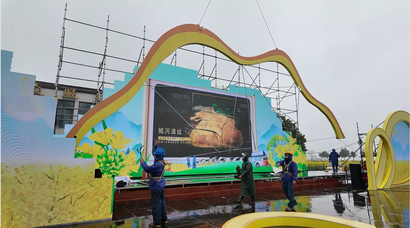 在张池村广场,开幕式主舞台搭建现场一派忙碌有序的景象,工人们正紧锣密鼓开展LED屏安装调试、农产品展销区搭建、线路安全排查等收尾作业,全力保障开幕式顺利举办。“我们从3月9日进场施工,依次完成舞台基础搭建、雷亚架架设、音响设备安装等工序,目前正在推进舞美布置的收尾工作,预计3月16日下午可全部完工。”舞台搭建负责人孙绪强介绍。