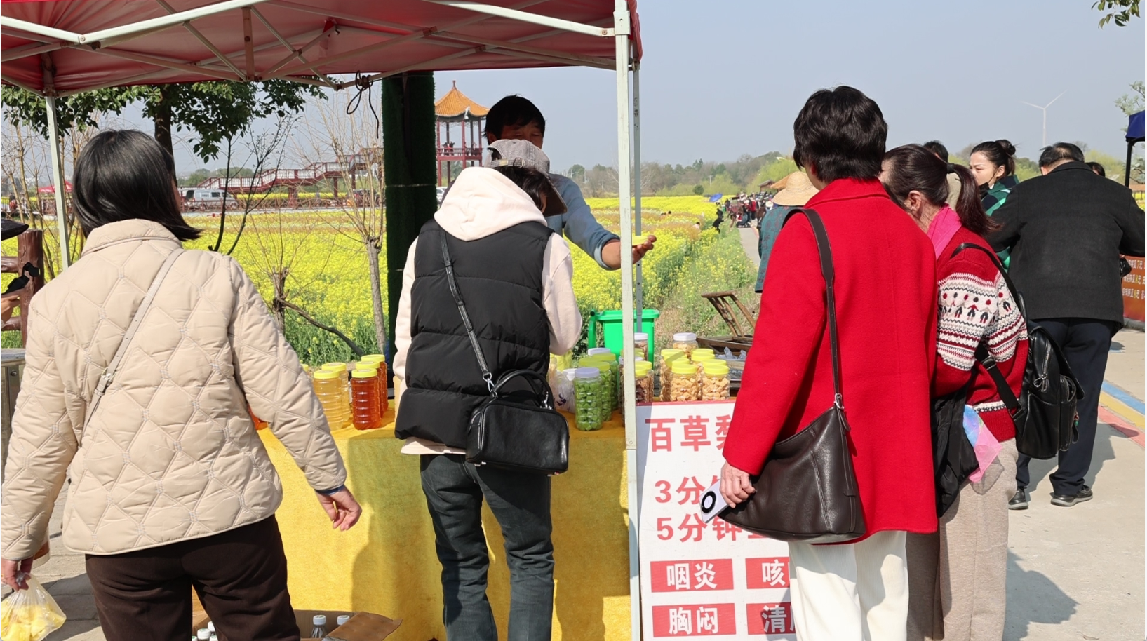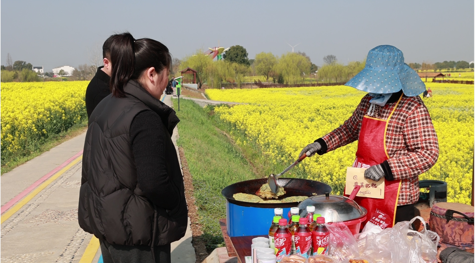 花海深处,热闹的不仅是春光,还有“地摊经济”带来的烟火气。借着油菜花旅游节的人气,沿线村民们在家门口支起摊位,将红薯片、萝卜干、时令小吃等土特产摆上“货架”。正在摊前煎制韭菜粑粑的张池村村民吴先兰忙得不亦乐乎:“这几天一天能卖两三百块钱,红薯片、干菜都是自家做的,游客就图个新鲜。”