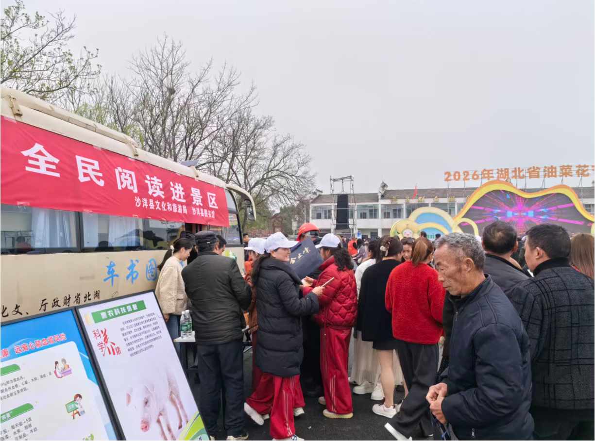 “花香伴书香,阅读润心田。”2026年湖北省油菜花节期间,在曾集镇张池村的花海里,沙洋县图书馆联合荆门市图书馆搭建起一处独特的风景——流动图书服务点,农业科技、文学经典、健康养生、少儿绘本……千余册经过精心挑选的图书,在花海中遇见知音。