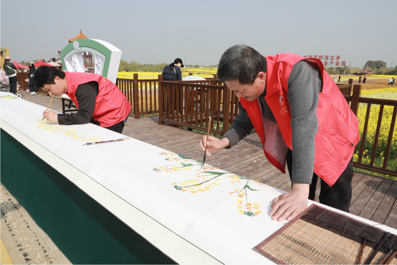 循着烂漫春色,一场别开生面的集体长卷创作在油菜花海间正式展开。书画名家领衔挥毫,美协会员精心勾勒,文艺志愿者热情邀请游客共同执笔,一幅长达50米的艺术长卷徐徐铺展,笔墨之间尽显楚韵悠长、田园诗意。