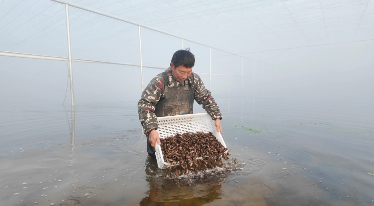 此前,谭金理一直从事传统稻田养虾,受气温波动和季节更替的双重制约,养殖周期固定、上市时间集中,产品容易陷入低价竞争,经济效益难以提升。为破解发展瓶颈,2025年,他主动转型,建起20亩温控养殖大棚,利用棚内温度常年高于室外3℃的优势,打破养虾的季节限制,实现冬春养虾、错峰上市,将传统的“一季养虾”转变为“四季有虾”。