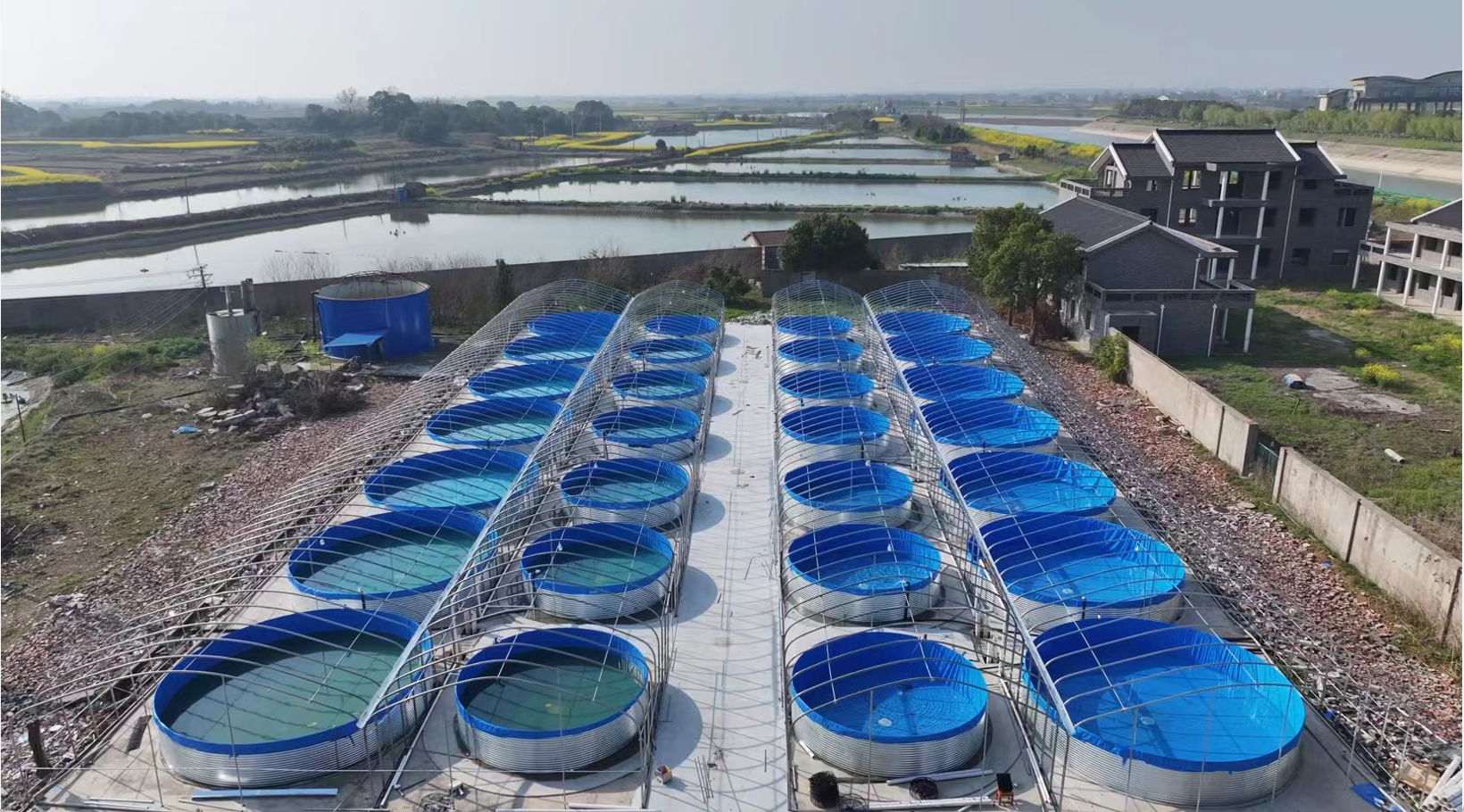 在后港镇的沙洋县佳鳙养殖中心项目施工现场,近万平方米的厂区内,崭新的钢构大棚整齐排列,陆基圆桶与标准化水泥池有序排布,工人们正抢抓工期,加紧调试各类设施,一座现代化渔业示范基地即将落成。